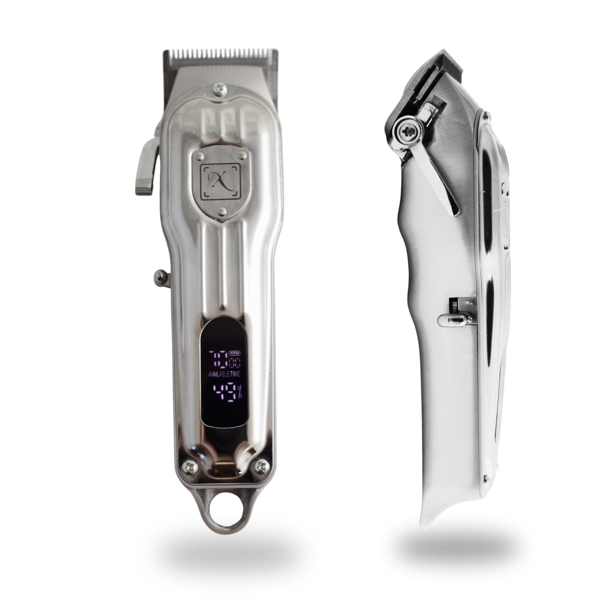 Full metal durable hair clipper for home or professional use.  Ergonomically designed with finger grooves and balanced weight for effortless smooth cutting action. Easy charge with USB C adapter.  Digital screen with speed and power level indicators. Super quiet powerful rotary motor for less room noise. 4 click adjuster arm for effortless fading. Package contains a full set of level guards. (Always oil blade before use for best results and blade life)